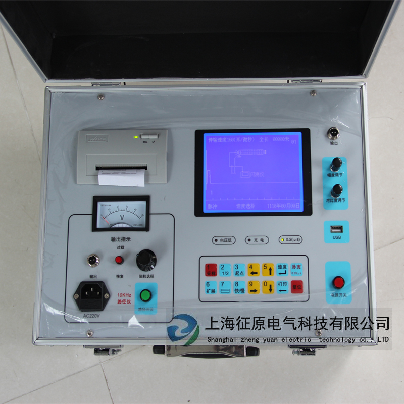 電纜故障一般分為兩大類:低阻、開路故障和高阻故障。儀器根據(jù)雷達測距原理,向電纜發(fā)射一個低壓脈沖或高壓脈沖。當遇到特性阻抗不匹配的地方時,就會產(chǎn)生反射波,儀器以極高的速度將發(fā)射波形和反射波形采集下來并顯示在屏幕上,用雙游標卡在波形的兩個特征拐點上。儀器根據(jù)電波在電纜中的傳播速度,便可測算出故障點到測試點的距離。