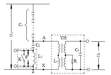 電容式電壓互感器接線如圖1-4所示,由電容分壓器(包括主電容器C1,分壓電容器C2)、中間變壓器(即中間互感器YH)、共振電抗器L1、載波阻抗器L2及阻尼電抗器R等元件組成。