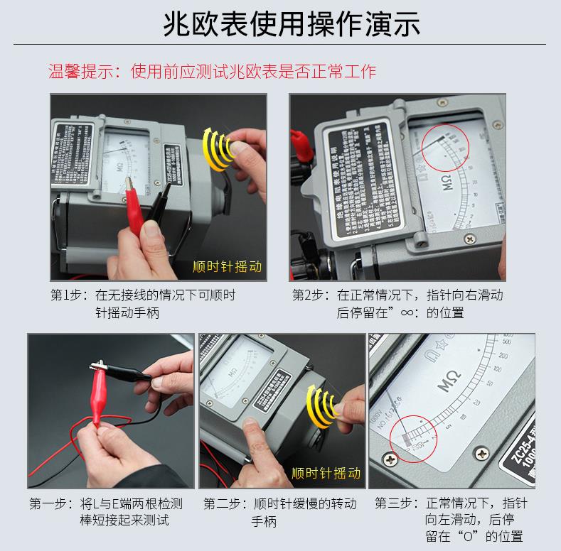 6、轉動搖手柄時應由慢漸快,如發(fā)現指針指零時不許繼續(xù)用力搖動,以防線路損壞。